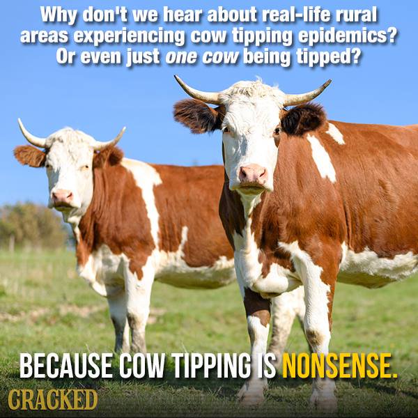 Source: pbs.twimg.com Doing so the farmers are making more money and the environment is saved tremendously. They are not inanimate objects that are. When someone walks into a bar or store and finds the most obese person in the place and proceeds to walk up, push them to the ground, and promptly vacate the premises. While cows are capable of sleeping in a standing position, and some do, they are extremely difficult to sneak up on. I wonder what usage does a cow have of money. Physics says you'd have more luck tipping a camry. From wikipedia, the free encyclopedia. Cow tipping on wikipedia notes: It's just a way to say that there's not much to do in a rural area (so bored you have to go tip cows for fun) or to say that something you're trying to do may i believe that was just a regional thing, though. Here are all the possible meanings and translations of the word cow tipping.